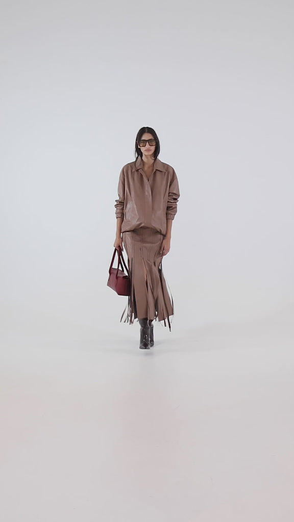 Esta chaqueta de piel color moka redefine la elegancia casual, con un corte relajado que no sacrifica ni un ápice de sofisticación. Su diseño atemporal y una silueta ligeramente holgada, la convierte en la pieza clave , desde un look diurno relajado hasta un conjunto nocturno con actitud. Un básico de lujo que irradia confianza y estilo.